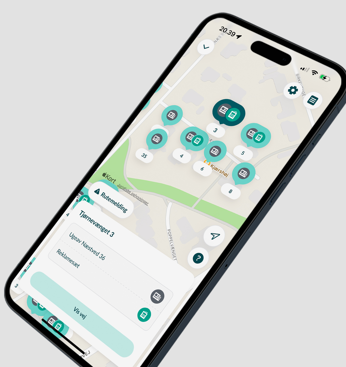 Er du ny på en rute, er det en fordel at bruge rutekortet, som guider dig rundt efter din gangrækkefølge. Swipe mellem adresser og se hvad du skal omdele, og hvordan du kommer ind i opgange. Samme information finder du også i adresselisten, som er din digitale bundtoverligger – som aldrig krøller eller blæser væk!